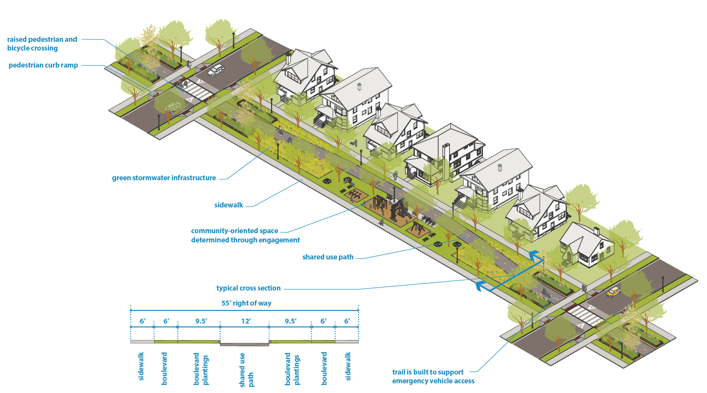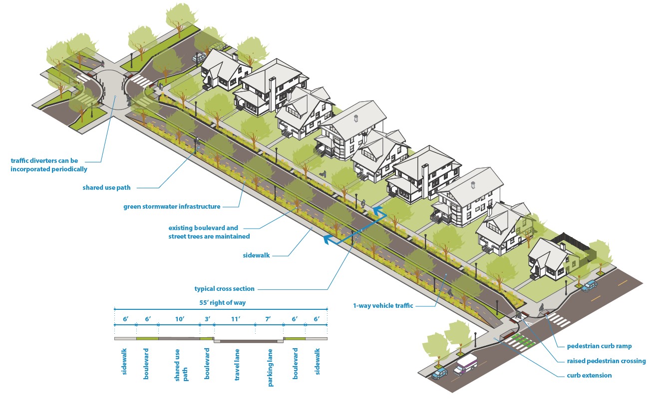 Full greenways may be used in combination with elements of bicycle boulevards depending on available right of way, community input, cost, availability of alley access, parking demand, and the need for green infrastructure to mitigate flooding. Some blocks may fully remove motor vehicle access, others may narrow the vehicular travel space by half and other blocks could primarily focus on intersection treatments such as curb extensions, median refuge islands, and traffic circles. |