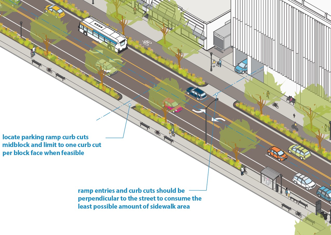 Access to and egress from parking ramps should be designed perpendicular to the street in a single curb cut, as shown in Figure 3.3I.2. This design promotes good visibility between pedestrians and vehicles and minimizes potential conflict points between pedestrians and vehicles. In large developments, it is recommended that vehicular curb cuts be located midblock and be limited to one curb cut per block face. Figure 3.3I.2: Parking ramp access/egress |