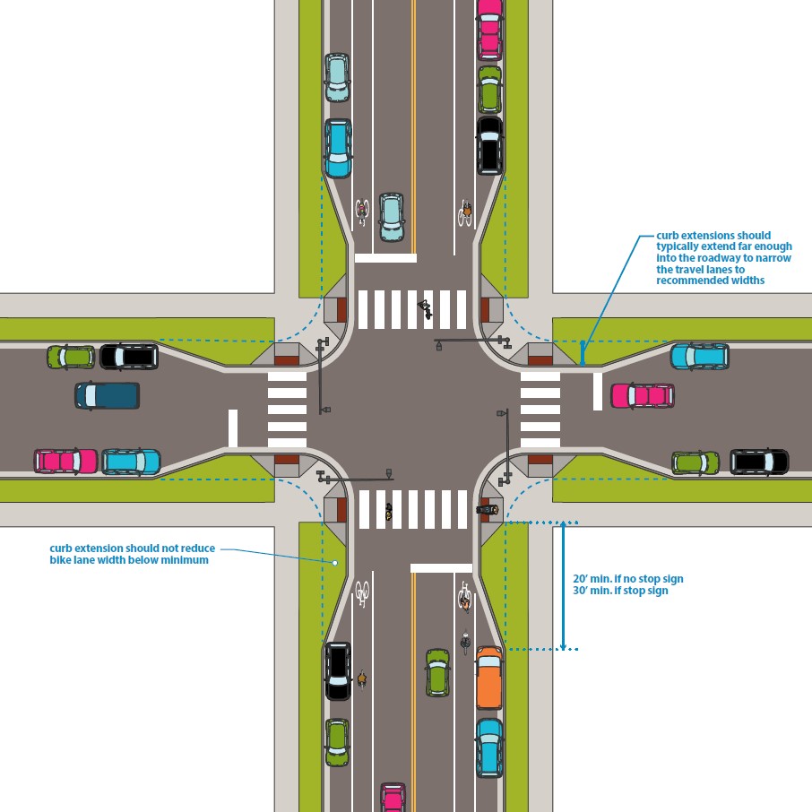 - Reduced pedestrian and bicycle crossing distance, thereby reducing pedestrian and bicycle exposure to potential vehicle conflicts.