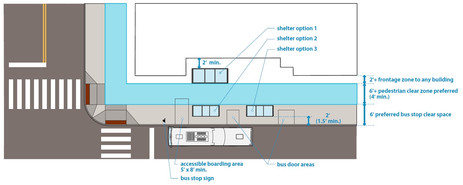 - The bus stop clear space boarding area and the pedestrian clear zone can be combined and the shelter can be placed in the frontage zone along the edge of the street right of way.